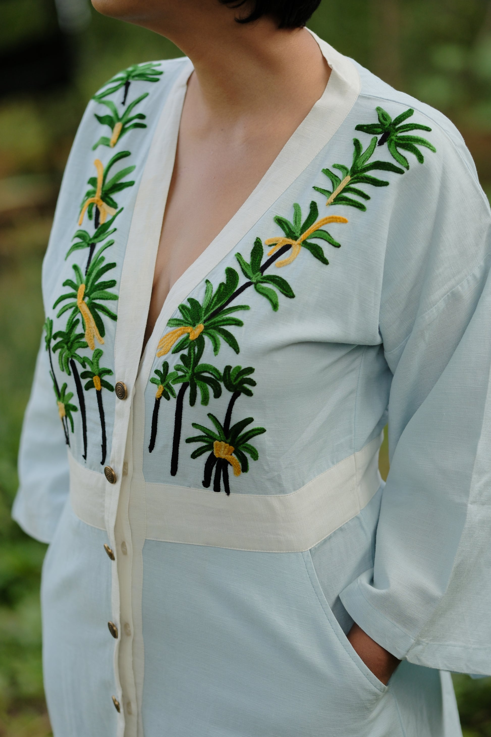 The kimono- inspired shape gives the dress its calm structure, while the palm tree embroidery carries the warmth of Indian coasts. If this dress speaks to you, maybe it’s because you also hold different places in your heart. Places that have shaped you, and journeys you’re still carrying forward.