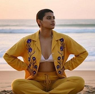 The yellow shirt with blue flower motif is an ode to the highs (yellow) and the lows (blue) in all of our lives. The moments of light and the stretches of shadow. The days that feel effortless and the ones that ask more of us. Both are lived. Both are ours.